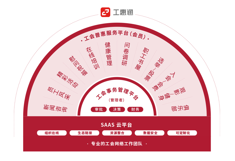 助力客戶工會打造線上線下相互促進、有機融合的新格局。直達客戶工會會員及工會組織,提供工會全領域、多平臺的一站式服務。使工會工作省時、省力、省心。