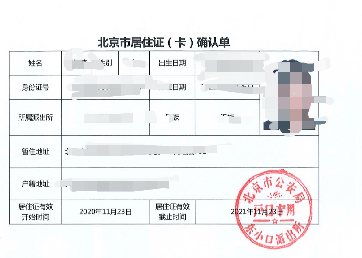 (5)申請人的《北京市居住證》實體卡或派出所出具的《北京市居住證確認單》原件(樣例見附件1)的彩色掃描件,有效期在3個月以上