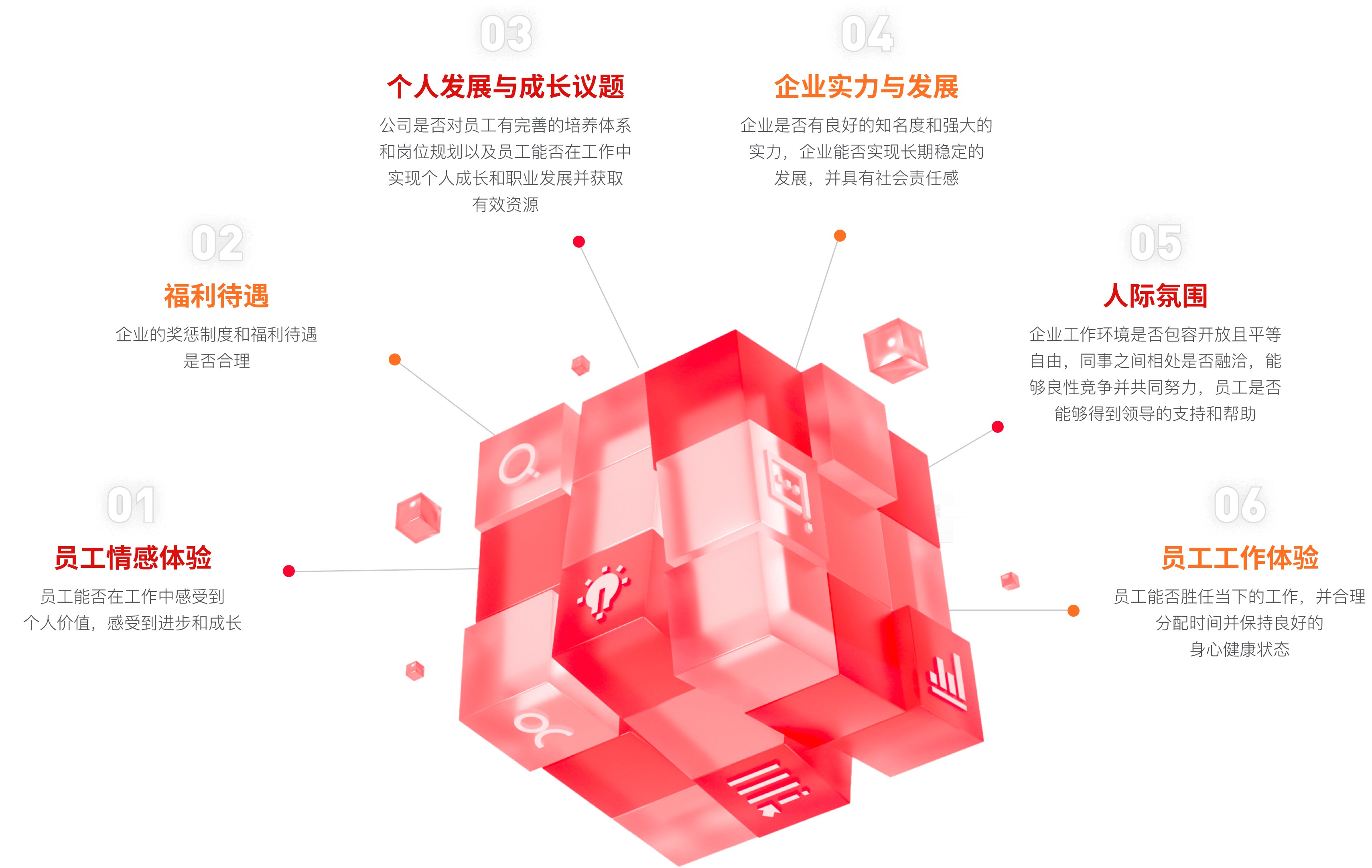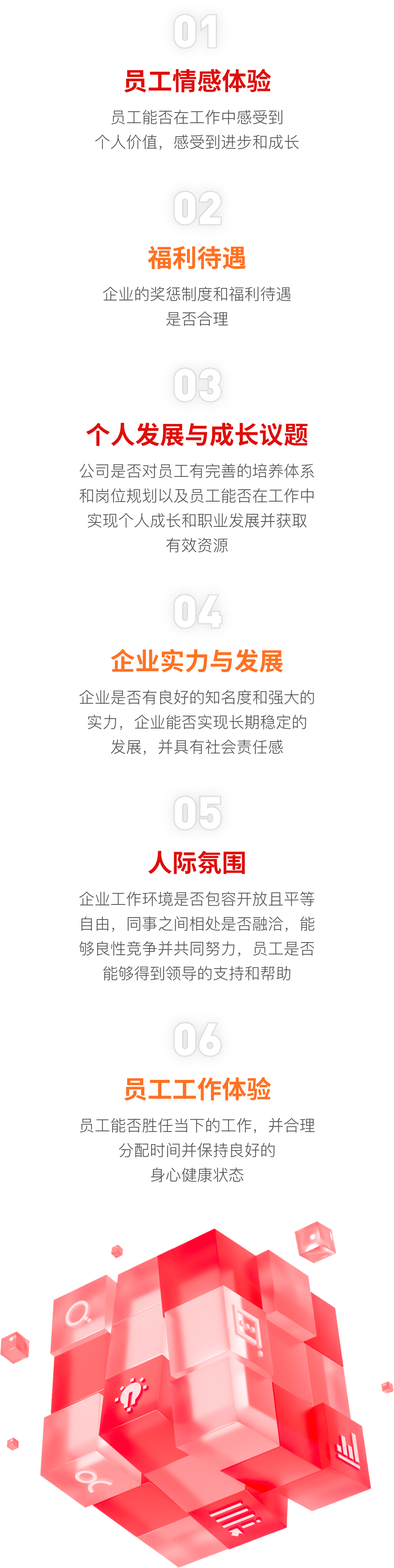 幸福企業測試依據員工心中衡量幸福企業的六大維度,并通過深入訪談企業員工,獨家開發幸福企業評定量表,用以評定員工在企業中的幸福要素及其幸福水平。測評結果將有效幫助企業提升員工的工作滿意度。